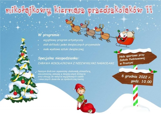 Wydarzeniu będzie towarzyszyć wyjątkowy program artystyczny, stół zapełniony świątecznymi przysmakami i wystawa świątecznej sztuki. Dla chętnych będzie możliwość wzięcia udziału w zabawie mikołajkowej, podczas której będzie można wygrać wyjątkowe nagrody. Cały dochód wypracowany w kiermaszu, zostanie przeznaczony na potrzeby przedszkola w Prostyni.