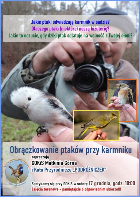 Koło Przyrodnicze Podróżniczek przy Gminnym Ośrodku Kultury i Sportu w Małkini Górnej zaprasza w najbliższą sobotę, 17 grudnia br. o godz. 10:00, na obrączkowanie ptaków przy karmiku.