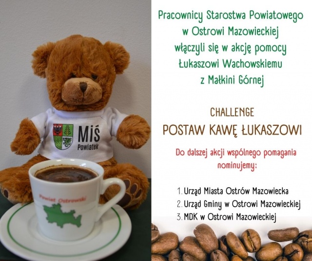 Pracownicy Starostwa Powiatowego w Ostrowi Mazowieckiej zostali nominowani przez pracowników małkińskiego oddziału Banku Spółdzielczego w Ostrowi Mazowieckiej do wzięcia udziału w challenge "POSTAW KAWĘ ŁUKASZOWI". Celem akcji jest zbiórka pieniędzy na kosztowną rehabilitację dla Łukasza Wachowskiego, mieszkańca gminy Małkinia Górna. Starostwo podjęło wyzwanie.
