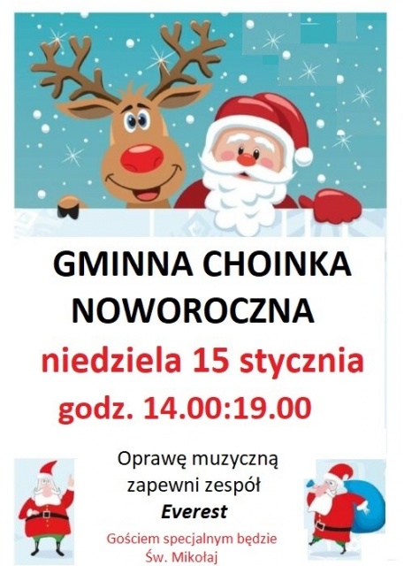 W niedzielę, 15 stycznia 2023 w godz. 14:00-19:00, odbędzie się Gminna Choinka Noworoczna. O muzyczną oprawę zadba grupa Everest, a gościem specjalnym wydarzenia będzie Święty Mikołaj.
