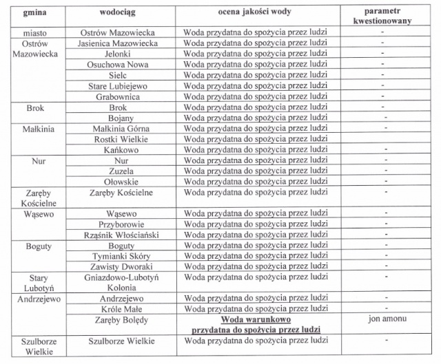 Przebadano 27 wodociągów, mieszczących się w 10 gminach i 1 mieście. 26 z nich otrzymało ocenę "woda przydatna do spożycia przez ludzi". Niższą ocenę otrzymał 1 wodociąg, Zaręby-Bolędy w gminie Andrzejewo, tj. "woda warunkowo przydatna do spożycia przez ludzi". Zakwestionowanym parametrem był jon amonu.
