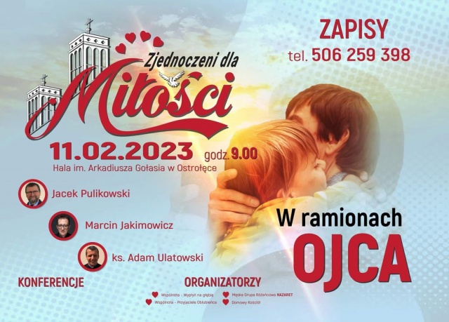Grupa Zjednoczeni dla Miłości łącząca cztery wspólnoty działające w parafii Zbawiciela Świata w Ostrołęce zaprasza 11 lutego 2023 na spotkanie charyzmatyczne pod hasłem "W ramionach Ojca".