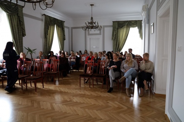 Funkcjonariuszka policji zaprezentowała działania oszustów, którzy wykorzystując uczucia drugiej osoby chcą ukraść oszczędności całego życia, przedstawiła m.in. zalecenia jak nie narazić się na bycie ofiarą oszusta, jak nie stracić zdrowego rozsądku i nie stać się ofiarą cyberprzestępstwa.