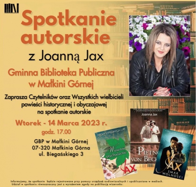 Książki jej autorstwa są jednymi z najczęściej wypożyczanych pozycji w małkińskiej bibliotece. Spotkanie odbędzie się we wtorek, 14 marca 2023 o godz. 17:00, w Gminnej Bibliotece Publicznej przy ul. W. Biegańskiego 3 w Małkini Górnej. Wstęp wolny!