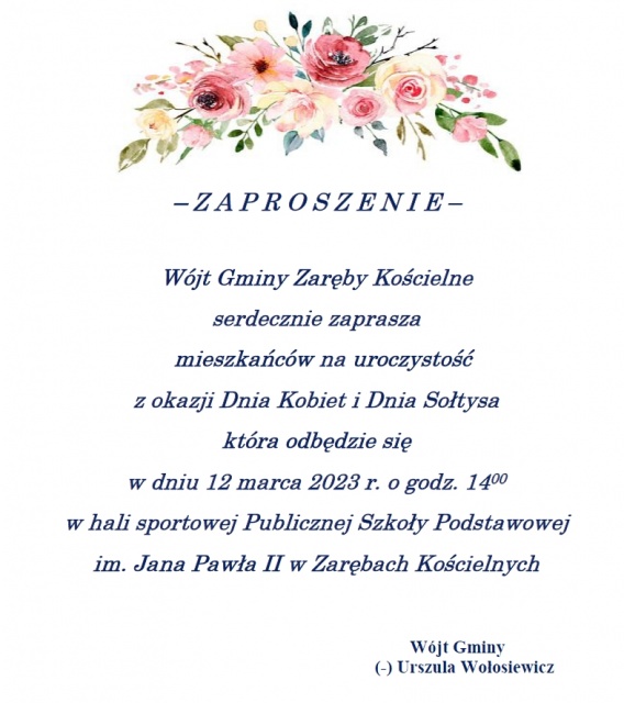 W niedzielę, 12 marca 2023 o godz. 14:00, na hali sportowej Publicznej Szkoły Podstawowej im. Jana Pawła II w Zarębach Kościelnych odbędzie się wydarzenie, związane z obchodami Dnia Kobiet, przypadającego 8 marca, oraz Dnia Sołtysa, przypadającego 11 marca.