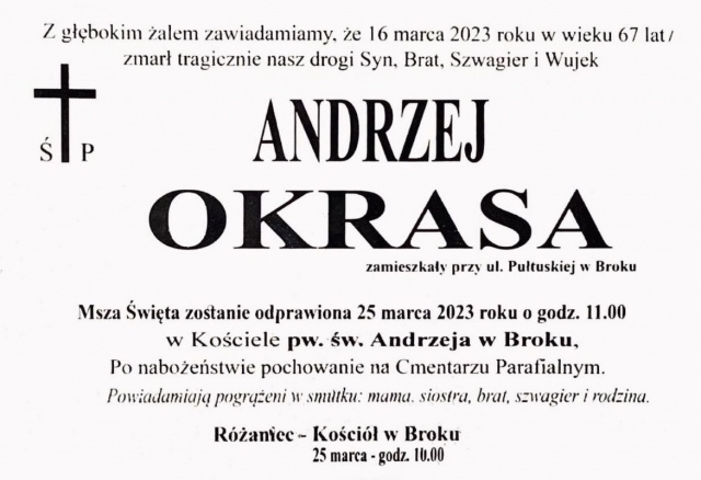 W dniu 16 marca 2023 roku zmarł tragicznie druh Andrzej Okrasa w wieku 67 lat. Msza święta zostanie odprawiona 25 marca o godzinie 11:00 w Kościele p.w. Świętego Andrzeja w Broku. Po nabożeństwie pochowanie na cmentarzu parafialnym.