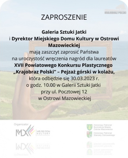Wręczenie nagród odbędzie się w czwartek, 30 marca 2023 roku o godz. 10:00 w Galerii Sztuki Jatki przy ul. Pocztowej 12 w Ostrowi Mazowieckiej.