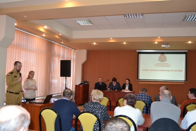 Następnie st. kapitan Rafał Kamiński - Naczelnik Wydziału Operacyjno-Szkoleniowego Komendy Powiatowej Państwowej Straży Pożarnej w Ostrowi Mazowieckiej przedstawił informację o działalności straży na terenie powiatu ostrowskiego i gminy Andrzejewo w 2022 r.