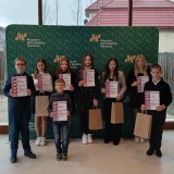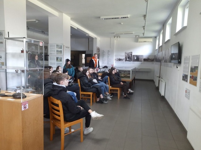 Następnie wraz z przewodnikiem, który w ciekawy sposób przedstawił historię obozu koncentracyjnego, uczniowie zwiedzali wystawę. W sali muzealnej można było obejrzeć makietę obozu, zdjęcia z tamtego okresu oraz wysłuchać relacji świadka tamtych wydarzeń zarejestrowanej na filmie.