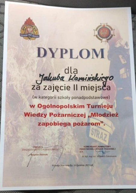 Druh Jakub Kamiński z Młodzieżowej Drużyny Pożarniczej OSP Nur, uczeń technikum w Zespole Szkół Ogólnokształcących i Zawodowych w Ciechanowcu zajął II miejsce w eliminacjach powiatowych Powiatu Wysokomazowieckiego Ogólnopolskiego Konkursu Wiedzy Pożarniczej "Młodzież Zapobiega Pożarom w kategorii szkół ponadpodstawowych.