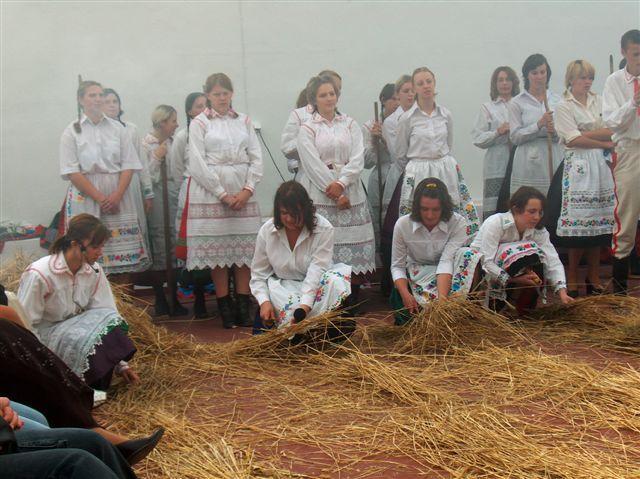 Tak więc, obserwowaliśmy przebudzenie wsi i przygotowywanie się mieszkańców do dożynek, zarzynek i żniwa - młodzież za pomocą sierpów "kosiła" zboże, następnie wiązała je i układała w snopki. Mgła, spowijająca pracującą na polu młodzież, a symbolizująca kurz powstały podczas żniw, robiła niesamowite wrażenie.