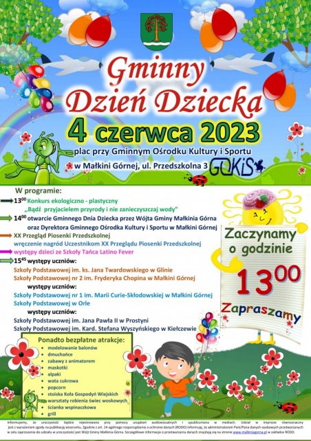 W niedzielę, 4 czerwca 2023, przy placu Gminnego Ośrodka Kultury i Sportu przy ul. Przedszkolnej 3 w Małkini Górnej, rozpocznie się pełne atrakcji wydarzenie. Pierwszy punkt uroczystości, o godz. 13:00, to konkurs ekologiczno-plastyczny pn. "Bądź przyjacielem przyrody i nie zanieczyszczaj wody". Młodzi artyści będą mogli wykazać się umiejętnościami i zdolnościami artystycznymi, a także zdobywać nową wiedzę na tematy ekologiczne.