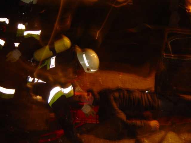 Medycy i strażacy przy ewakuacji rannego