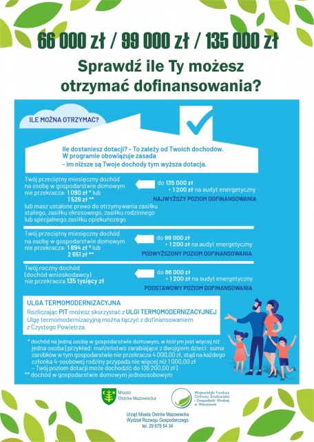 Dofinansowanie w kwocie 66.000, 99.000 lub 135.000 zł, jest możliwe dzięki środkom Wojewódzkiego Funduszu Ochrony Środowiska i Gospodarki Wodnej w Warszawie. Osobom, które spełniają warunki dofinansowania, kwota przyznawana jest na prostej zasadzie - im niższe dochody, tym wyższa dotacja.