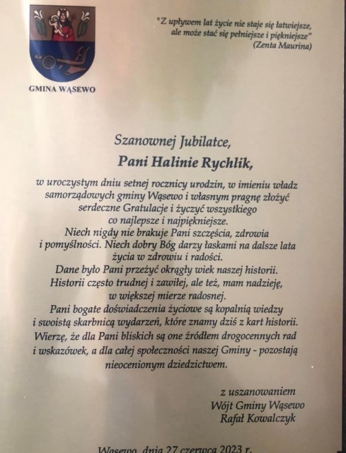 W dniu 27 czerwca 2023 swoje setne urodziny obchodziła Halina Rychlik mieszkanka gminy Wąsewo. Z tej okazji jubilatkę odwiedziła delegacja z urzędów administracji publicznej: Rafał Kowalczyk wójt gminy Wąsewo, Agnieszka Krupińska przedstawicielka Wojewody Mazowieckiego, Mirosław Augustyniak przedstawiciel Marszałka Województwa Mazowieckiego, Cecylia Bartczak zastępczyni kierownika USC w Wąsewie oraz ks. Leszek Rukat - proboszcz wąsewskiej parafii wraz z ks. Dariuszem Krajewskim, którzy w setną rocznicę złożyli jubilatce najserdeczniejsze życzenia zdrowia, pogody ducha, życzliwości ze strony najbliższych osób oraz sił i wytrwałości, aby doczekać kolejnych jubileuszy.