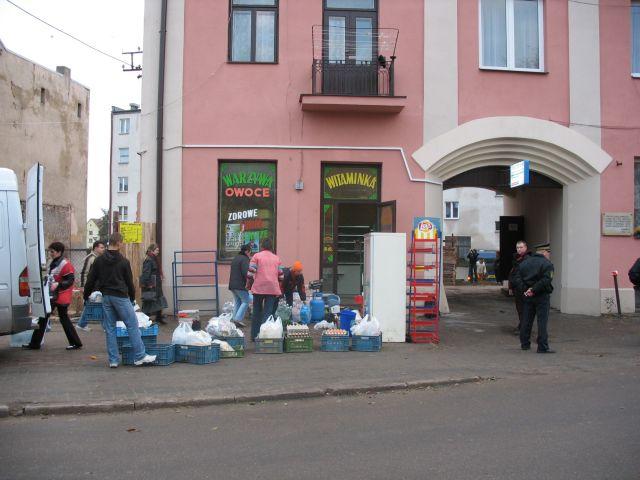 Geodeci mierzą czy sciana się nie pochyla, a pan Kaczor razem z ekipą przy pomocy zagęszczarki ubijaja teren przed sklepem mięsnym, a cała ziemia drży