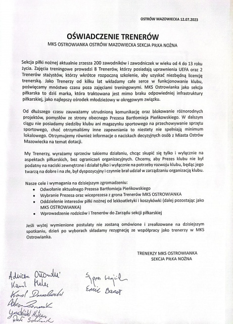W swoim oświadczeniu stawiają 4 jasne warunki, tj. odwołanie aktualnego prezesa Bartłomieja Pieńkowskiego, wybranie prezesa oraz wiceprezesa z grona trenerów MKS Ostrowianka, wprowadzenie rodziców i trenerów do zarządu sekcji piłkarskiej oraz oddzielenie interesów piłki nożnej od lekkoatletyki i koszykówki, dalej funkcjonując pod szyldem MKS-u. W przypadku niespełnienia wymienionych postulatów, trenerzy zapowiadają złożenie rezygnacji z pełnionych stanowisk w klubie MKS Ostrowianka.