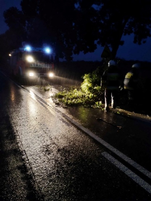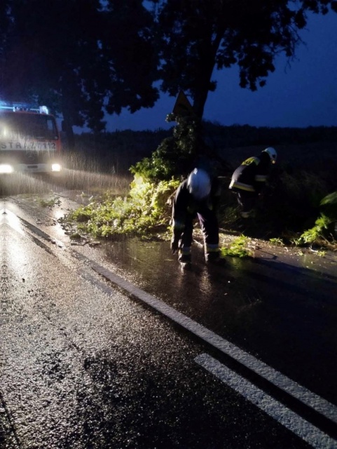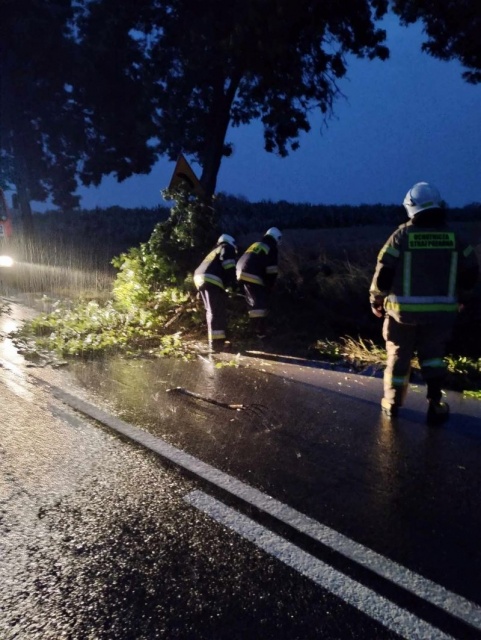 Tym razem kilka drzew znajdowało się na drodze łączącej Andrzejewo z Dąbrową. Zadaniem strażaków było usunięcie zagrożenia oraz uprzątnięcie pozostałości drzew z jezdni.