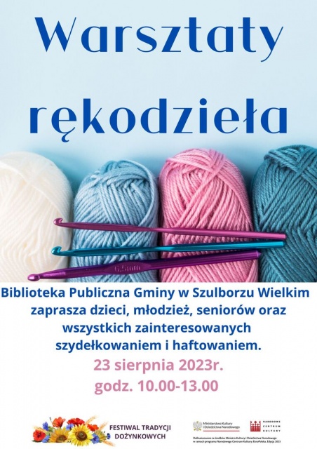 Biblioteka Publiczna Gminy Szulborze Wielkie zaprasza na warsztaty rękodzielnicze, poświęcone sztuce robienia na drutach, haftowania i szydełkowania. Uczestnicy tych warsztatów zobaczą co można zrobić na szydełku i jak się do tego zabrać. Ponadto nauczą się podstawowego ściegu, który może stać się początkiem przygody z szydełkowaniem. Warsztaty umożliwią rozwinięcie umiejętności i poszerzenie wiedzy na temat rękodzielniczych technik.