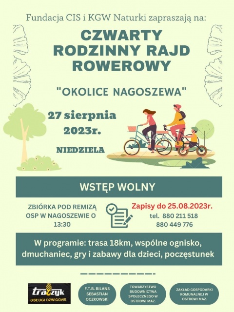 Rajd rozpocznie się pod remizą Ochotniczej Straży Pożarnej w Nagoszewie, w niedzielę 27 sierpnia 2023 o godz. 13:30. Następnie uczestnicy ruszą w trasę liczącą 18 km. Obowiązują zapisy, ale udział w rowerowej wycieczce jest bezpłatny.