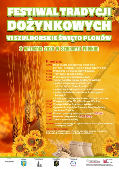 W ramach festiwalu, w Bibliotece Publicznej Gminy Szulborze Wielkie odbyły się już warsztaty rękodzieła. Na uczestników czeka wystawa dawnego sprzętu rolniczego, impreza plenerowa z korowodem dożynkowym "O tym jak we żniwa bywało...", turniej sołectw i tradycyjna biesiada dożynkowa. Co więcej, przez cały wrzesień można oglądać wystawę dawnych maszyn "Dożynki z dawnych lat", na której będzie można zobaczyć wiele maszyn rolniczych, które były wykorzystywane w przeszłości.