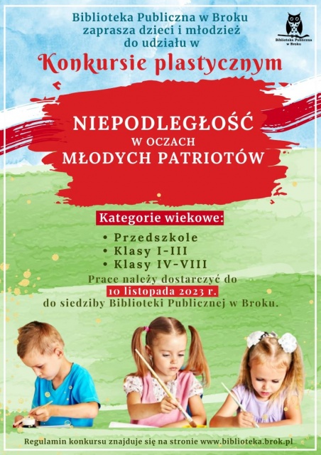 Praca konkursowa powinna być ilustracją, odzwierciedlającą temat "Niepodległość w oczach młodych patriotów". Interpretacja tematu jest dowolna, jednak mile widziane są elementy nawiązujące do historii oraz walorów miasta i gminy Brok. Prace mogą być wykonane w dowolnej technice plastycznej i powinny mieć format A4 lub A3."