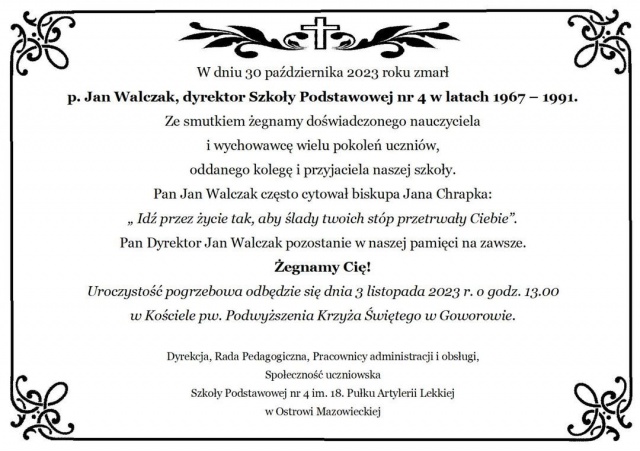 - w dniu 30 października 2023 zmarł Jan Walczak w wieku 91 lat, zamieszkały w Ostrowi Mazowieckiej. Jan Walczak był dyrektorem Szkoły Podstawowej nr 4 w latach 1967-1991, wychowawcą wielu pokoleń. Uroczystości żałobne odbędą się w Domu Pogrzebowym Brzeźno 16 w dniu 3 listopada 2023 o godz. 13:00 Msza święta zostanie odprawiona w Kościele pw. Podwyższenia Krzyża Świętego w Goworowie. Miejsce pochówku cmentarz parafialny w Goworowie.