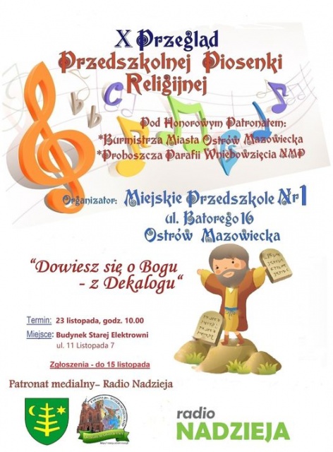 W czwartek, 23 listopada 2023 o godz. 10:00, Miejskie Przedszkole nr 1 w Ostrowi Mazowieckiej zorganizuje X Przegląd Piosenki Religijnej pn. "Dowiesz się o Bogu - z Dekalogu" w Starej Elektrowni, przy ul. 11 listopada 7. W ramach inicjatywy wystąpią dzieci z trzech miejskich przedszkoli.
