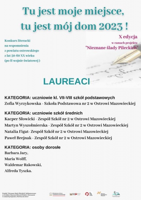 W czwartek, 30 listopada 2023 o godz. 17:00, w Starej Elektrowni przy ul. 11 Listopada 7 w Ostrowi Mazowieckiej, odbędzie się oficjalne zwieńczenie 10. edycji projektu pn. "Nieznane ślady Pileckich". Podczas wydarzenia nagrodzenie zostaną zwycięzcy konkursu literackiego pn. "Tu jest moje miejsce, tu jest mój dom". Konkurs miał na celu promowanie historii oraz tradycji naszego regionu z okresu II wojny światowej, rozbudzenie talentów artystycznych i umożliwienie uczestnikom prezentacji własnych dokonań. Zadanie konkursowe polegało na napisaniu tekstu prozatorskiego, który miał nawiązywać treścią do wątków z życia w okresie powojennym na terenie powiatu ostrowskiego.
