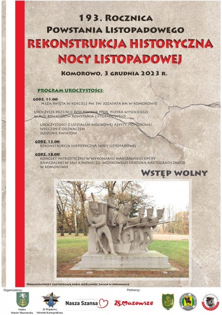Uroczystości rozpoczną się o godz. 11:00 w kościele pw. św. Jozafata Biskupa i Męczennika, przy ul. Kościelnej 5/1 w Komorowie, gdzie odprawiona zostanie msza święta. Po liturgii odbędzie się uroczyste przejście z udziałem Wojska Asysty Honorowej pod pomnik ppor. Piotra Wysockiego w alei Bohaterów Powstania Listopadowego.