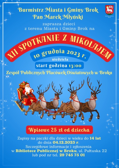 Burmistrz miasta i gminy Brok Marek Młyński, serdecznie zaprasza wszystkich mieszkańców i nie tylko, do uczestnictwa w tej wyjątkowej imprezie, która odbędzie się 10 grudnia 2023 o godz. 13:00 na terenie Zespołu Publicznych Placówek Oświatowych w Broku, przy ul. Jana Pawła II 50. Jednocześnie informuje, że obowiązuje symboliczne wpisowe w wysokości 25 złotych.
