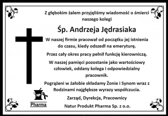 Z wielkim żalem i smutkiem przyjęto wiadomość o śmierci Andrzeja Jędrasiaka, odpowiedzialnego, wieloletniego pracownika Natur Produkt Pharma Sp. z o.o., oddanego kolegi, a przede wszystkim wartościowego człowieka.