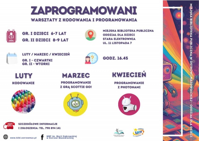 W lutym, marcu oraz kwietniu ostrowska biblioteka zorganizuje warsztaty z kodowania pn. "Zaprogramowani" dla dzieci. W lutym uczestnicy odkryją świat kodowania używając mat i kolorowych kubków. W marcu dzieci nauczą się programować razem z kosmitą z gry Scottie Go!. W kwietniu zaplanowano zajęcia z programowania z użyciem robotów Photon.