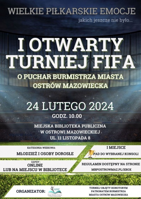 Turniej został objęty honorowym patronatem burmistrza miasta Ostrów Mazowiecka. Odbędzie się 24 lutego w Miejskiej Bibliotece Publicznej przy ul. 11 Listopada 8 (I piętro). Do zobaczenia na boisku/ekranie!