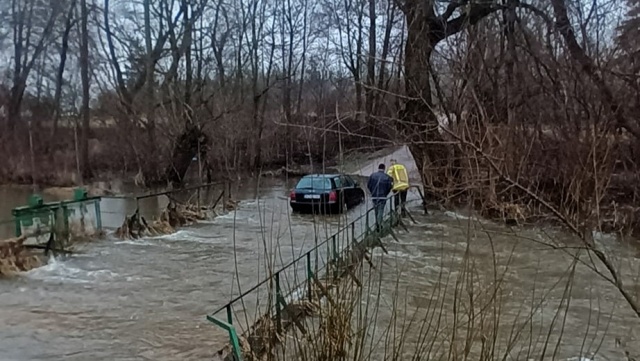 Kierowca podjął próbę pokonania zalanego mostu w Jabłonowie-Klaczach. Okazało się, że nie był to najlepszy pomysł. Szybka reakcja strażaków uratowała sytuację.