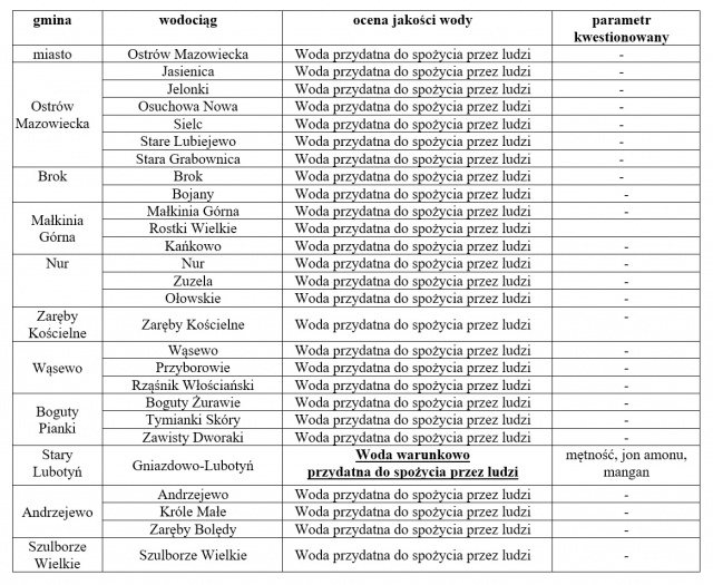 W ocenie za IV kwartał roku 2023, uchylenia od normy wykryto w gminie Stary Lubotyń, w wodociągu Gniazdowo - Lubotyń. Jest to jedyny wodociąg, który otrzymał ocenę "woda warunkowo przydatna do spożycia przez ludzi". Zakwestionowanym parametrem był jod amonu i mangan, podejrzenia wzbudziła również mętność wody.