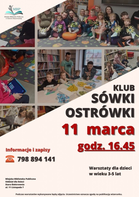 W poniedziałek, 11 marca 2024 o godz. 16.45, w Miejskiej Bibliotece Publicznej w Ostrwi Mazowieckiej odbędzie się kolejne spotkanie Klubu Sówki Ostrówki - warsztaty literacko-plastyczno-ruchowe, na których dzieci w wieku 3-5 lat uczą się pracy z prostym tekstem literackim poprzez zabawę.