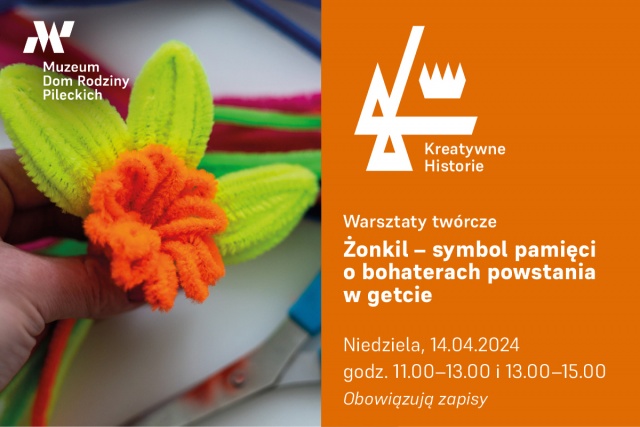 W niedzielę, 14 kwietnia 2024 w godz. 11:00 - 13:00 oraz 13:00-15:00, w Muzeum Dom Rodziny Pileckich zostaną zorganizowane kolejne warsztaty z cyklu "Kreatywne Historie". Tym razem uczestnicy wykonają żonkile z drucików kreatywnych oraz papieru.
