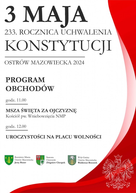 Urząd Miasta i Gminy Brok organizuje uroczyste obchody 233. rocznicy uchwalenia Konstytucji 3 Maja.