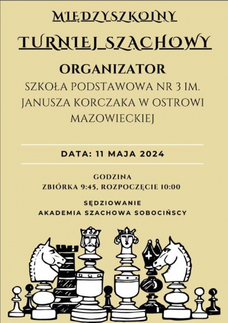Turniej, który jest organizowany przez Szkołę Podstawową nr 3 im. Janusza Korczaka w Ostrowi Mazowieckiej, rozpocznie się już jutro, 11 maja 2024 roku, o godzinie 10:00. Wydarzenie będzie sędziowane przez Akademię Szachową Sobocińscy, co gwarantuje profesjonalizm i uczciwość w przeprowadzeniu zawodów.