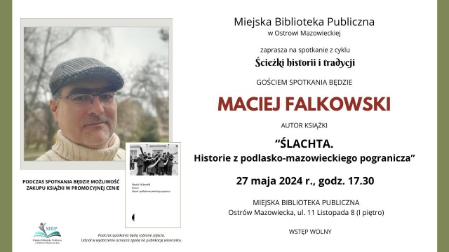Spotkanie będzie dotyczyć książki "Ślachta. Historie z podlasko-mazowieckiego pogranicza". Jak mówi sam autor: - Gdy jako dziecko słuchałem opowieści babci, miałem wrażenie, że oglądam film. Widziałem "Ruskiego", który w 1940 lub 1941 roku, grając na bałałajce, płoszył konie nad rzeczką Brok, i piękną lalkę, którą pewna Żydówka podarowała mojej prababci w zamian za przeprowadzenie przez granicę. Słyszałem świst kul, od których kilka lat później zapaliła się cała wieś, i jęki rannych żołnierzy w prowizorycznym szpitalu polowym urządzonym jesienią 1939 roku miejscowym kościele.