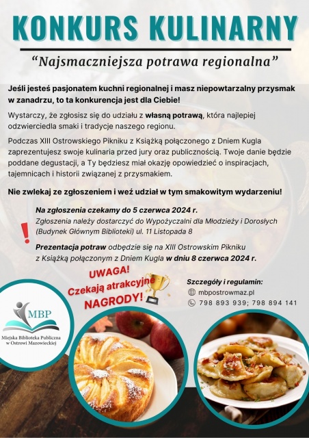 Miejska Biblioteka Publiczna organizuje konkurs kulinarny "Najsmaczniejsza potrawa regionalna", w którym uczestnicy przygotują potrawy regionalne i podadzą je jury. Uczestnik będzie mógł przedstawić swoje danie (opowiedzieć historię, sposób przygotowania itp.).