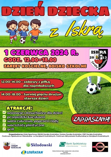 Klub piłkarski Iskra Zaręby Kościelne zaprasza wszystkie dzieci wraz z rodzinami na wspaniały piknik z okazji Dnia Dziecka. Impreza odbędzie się w sobotę, 1 czerwca 2024, na boisku szkolnym przy Publicznej Szkole Podstawowej im. Jana Pawła II w Zarębach Kościelnych, w godz. 12:00-18:00.