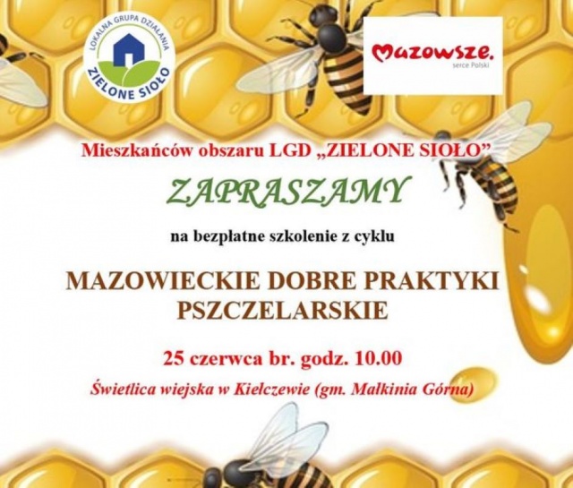 Mieszkańców obszaru LGD "ZIELONE SIOŁO" zapraszamy na wyjątkowe szkolenie z cyklu "Mazowieckie Dobre Praktyki Pszczelarskie", które odbędzie się 25 czerwca w Kiełczewie. To doskonała okazja do zdobycia wiedzy i umiejętności związanych z pszczelarstwem, a także do poznania roli pszczół w ekosystemie.