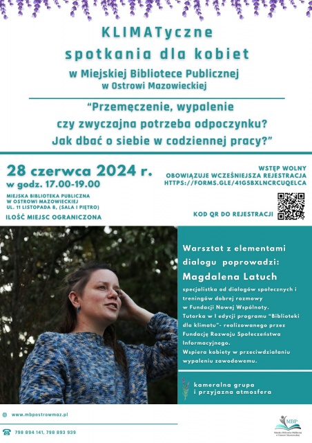 Spotkanie odbędzie się w bibliotece, w piątek, 28 czerwca 2024 o godz. 17:00. Prowadzącą będzie Magdalena Latuch - specjalistka od dialogów społecznych, treningów dobrej rozmowy, wspierania kobiet w przeciwdziałaniu wypaleniu zawodowemu. Podczas spotkania ekspertka podpowie, jak rozpoznawać sygnały ostrzegawcze nadmiernego stresu i przeciążenia pracą, a także przedstawi praktyczne strategie dbania o siebie w codziennych obowiązkach zawodowych.