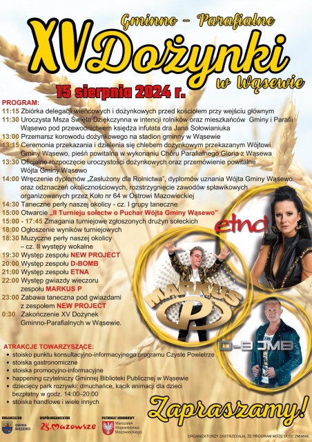 Organizator wydarzenia zastrzega sobie prawo do zmian w programie. Organizatorem XV Dożynek Gminno-Parafialnych w Wąsewie jest Urząd Gminy w Wąsewie. Honorowy patronat nad wydarzeniem objął Adam Struzik, marszałek województwa mazowieckiego.