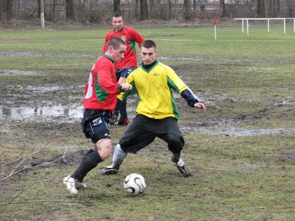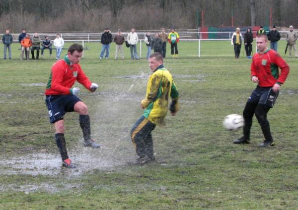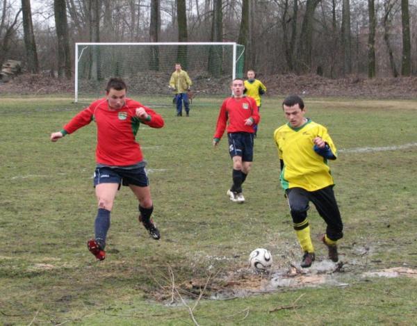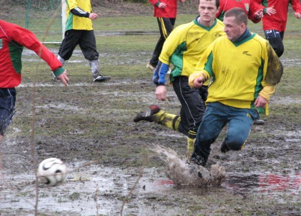 Pierwsza bramka dla zespołu MKS-u wpadła już po kilku minutach od pierwszego gwizdka sędziego. Piłkarze Małkini wykonywali rzut wolny z skraju pola karnego, piłka została dośrodkowana na długi słupek wprost pod nogi Arka Borowego, lecz ten zamiast ją wybić na rzut rożny "skiksował", do futbolówki dopadł napastnik MKS-u i skierował piłkę w krótki róg bramki bronionej przez Pawła Śledzińskiego i było 1:0 dla Małkinian. Ta stracona bramka podziałała na zespół Ostrovi jak płachta na byka, już kilka minut po niej "kaesiacy" doprowadzają do wyrównania, ale po licznych protestach piłkarzy MKS-u, sędzia odgwizduje spalonego (nie słusznie bramka została zdobyta prawidłowo). Mecz był bardzo wyrównany z lekką przewagą Ostrowiaków, ale naszym piłkarzom w rozgrywaniu piłki bardzo przeszkadzało grząskie i pełne wody boisko (wielokrotnie piłka stawała w wodzie). Kwadrans przed końcem pierwszej połowy na 1:1 strzela nie zawodny Robert Wilczewski, lecz niestety zaraz po strzelonej bramce, błąd popełnia nasz bramkarz, który wyszedł na 16 metr do górnej piłki zagranej do napastnika MKS-u, ale ten uderzył z pierwszej piłki i zrobiło się już 2:1. Końcówka pierwszej części meczu była bardzo emocjonująca, akcje toczyły się od bramki do bramki. Po jednej z akcji piłkarzy KS-u mogła paść bramka na 2:2 po strzale głową Pawła Krajewskiego, ale tutaj piękną paradą bramkarską wykazał się golkiper MKS-u. Niestety po mimo tak ofensywnej gry nadal popełnialiśmy błędy w defensywie i pierwsza połowa zakończyła się ostatecznie wynikiem 3:1 dla MKS-u Małkinia.