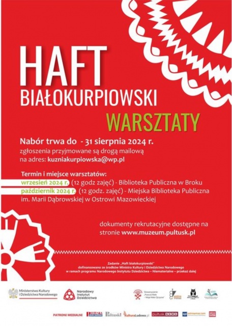 Warsztaty, prowadzone przez twórczynię ludową Beatę Pasińską z Broku, odbędą się w dwóch cyklach - we wrześniu w Broku oraz w październiku w Ostrowi Mazowieckiej. Uczestnicy będą mieli okazję poznać tajniki haftu białokurpiowskiego podczas czterech spotkań, trwających po trzy godziny każde.
