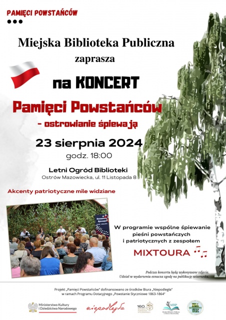 Miejska Biblioteka Publiczna im. Marii Dąbrowskiej serdecznie zaprasza dzieci oraz osoby dorosłe na wyjątkowy koncert "Pamięci Powstańców", który odbędzie się w piątek, 23 sierpnia 2024 o godz. 18:00 w ogrodzie biblioteki. W ramach wydarzenia mieszkańcy Ostrowi będą mieli okazję wspólnie zaśpiewać pieśni powstańcze i patriotyczne, pod przewodnictwem zespołu Mixtoura. Na scenie pojawią się również młodzi artyści z miejskich przedszkoli, którzy włączą się w historyczną inicjatywę.