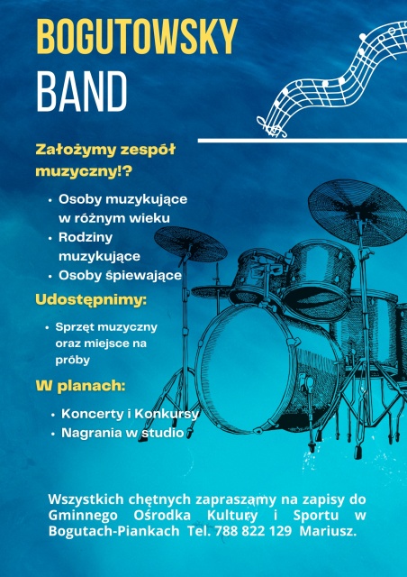 W Gminnym Ośrodku Kultury i Sportu w Bogutach-Piankach ogłoszono zapisy do nowo powstającego zespołu muzycznego Bogutowsky Band. Projekt skierowany jest do wszystkich osób muzykujących, bez względu na wiek. Zapraszane są zarówno osoby grające na instrumentach, śpiewające, jak i całe muzykujące rodziny.